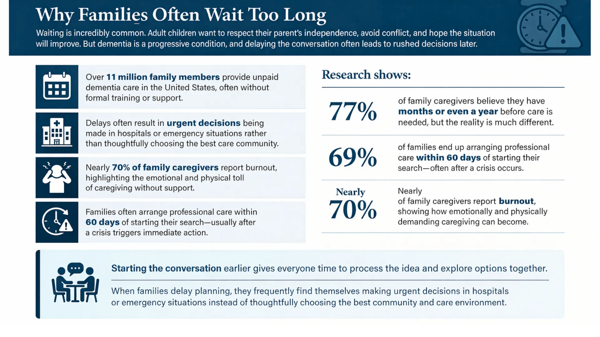 Instead, families often wait until something urgent happens—a fall, wandering incident, hospitalization, or sudden cognitive decline—and the decision must be made quickly under intense stress.