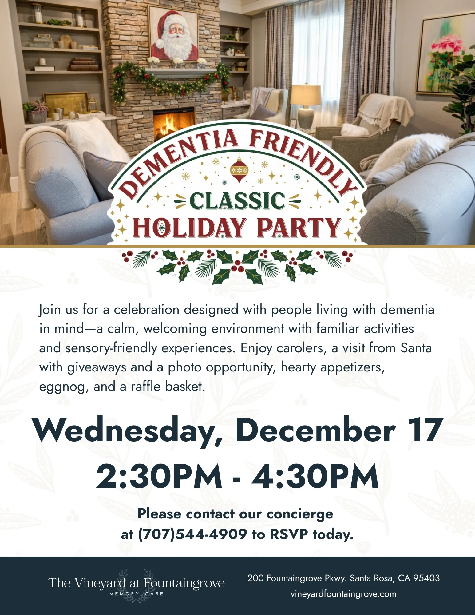 The holiday season is a time for togetherness, joy, and meaningful moments—and we’re excited to host a Dementia Friendly Holiday Party designed specifically with the comfort of loved ones living with dementia in mind.