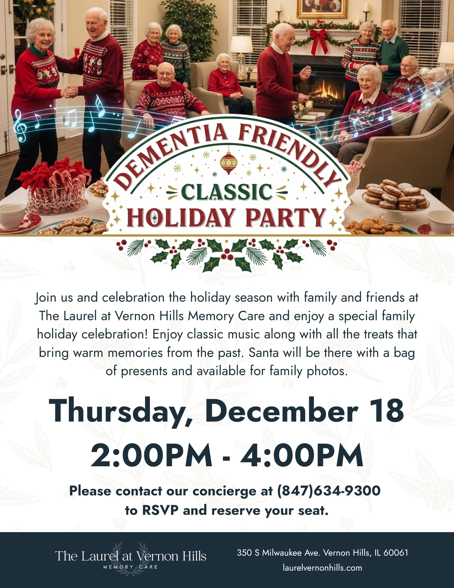 Join us and celebration the holiday season with family and friends at The Laurel at Vernon Hills Memory Care and enjoy a special family holiday celebration! Enjoy classic music along with all the treats that bring warm memories from the past. Santa will be there with a bag of presents and available for family photos.