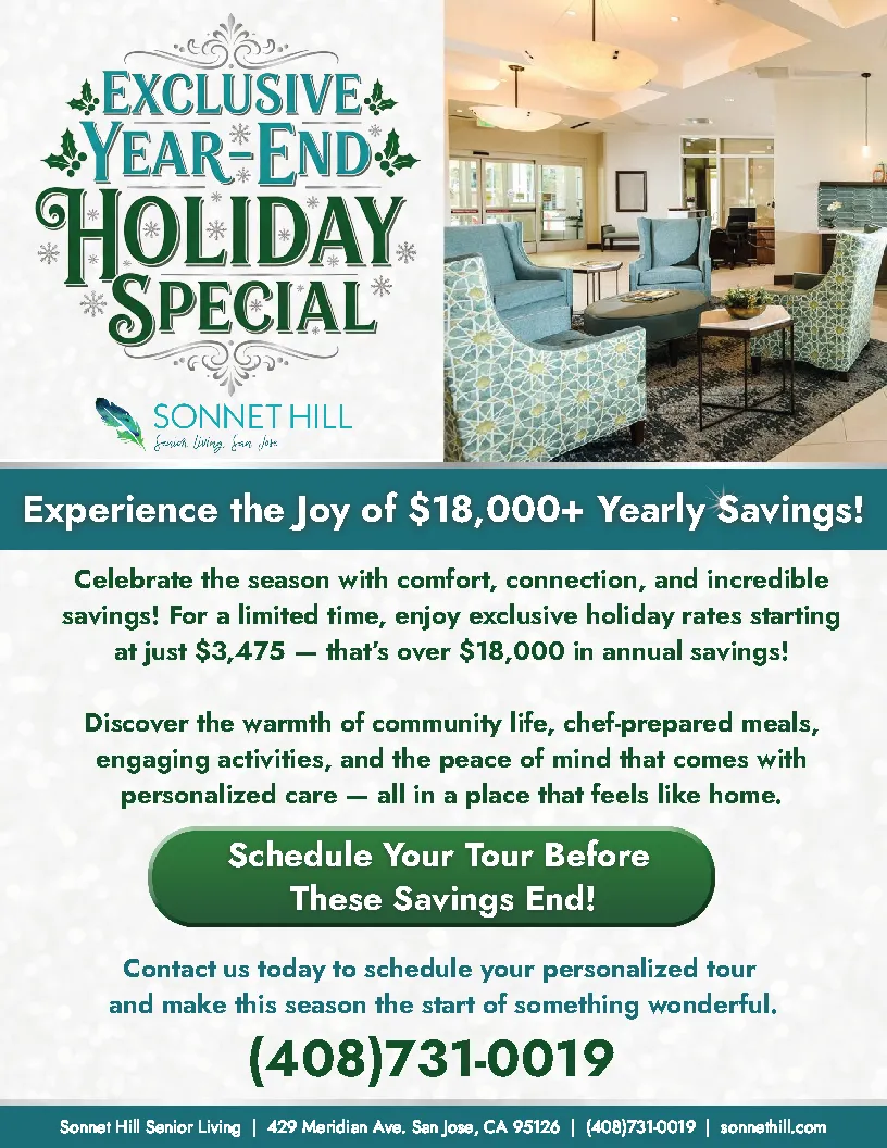 Celebrate the season with comfort, connection, and incredible savings! For a limited time, Sonnet Hill Senior Living is offering exclusive holiday rates starting at just $3,475 per month — that’s over $18,000 in yearly savings on exceptional senior living.