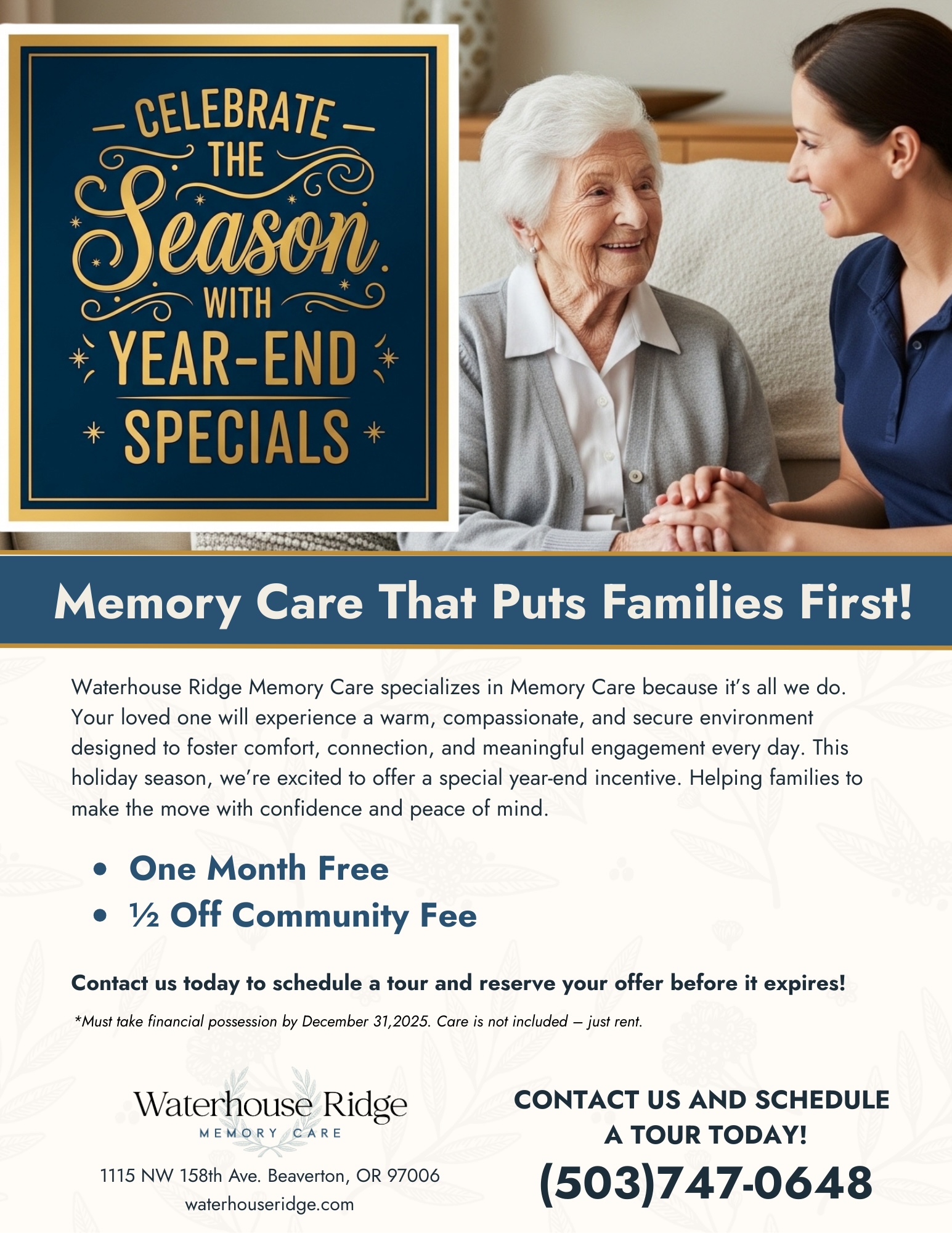 Waterhouse Ridge Memory Care specializes in Memory Care because it’s all we do. Your loved one will experience a warm, compassionate, and secure environment designed to foster comfort, connection, and meaningful engagement every day.